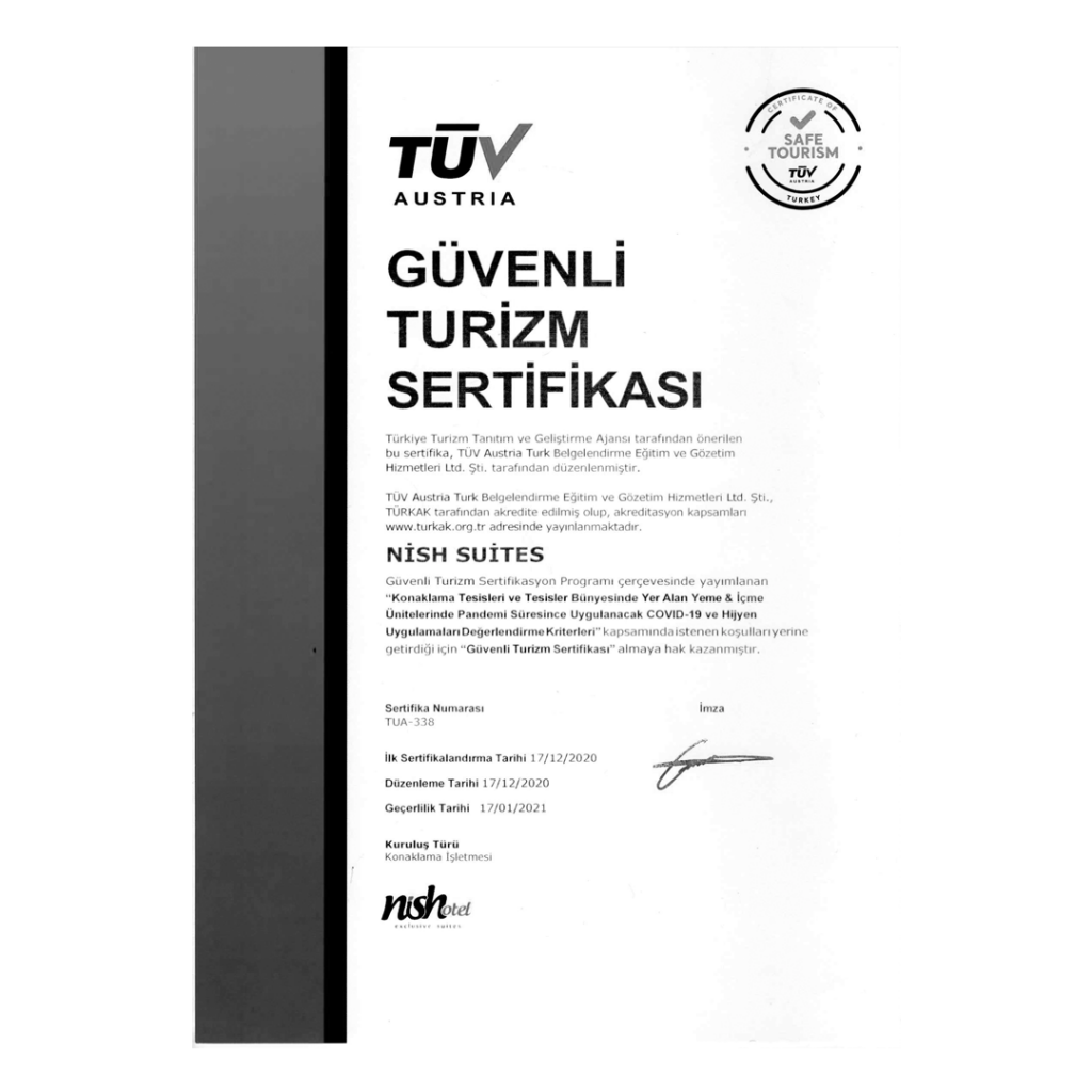 Nish Suites bünyesindeki tüm otellerimizde misafirlerimizin sağlık, güvenlik ve konforu önceliğinde titizlikle çalışmaya devam ediyoruz. Güvenli Turizm Sertifikalarımızın kapsadığı tüm tedbirler ve çok daha fazlasını yerine getirerek hem değerli misafirlerimiz hem de çalışanlarımıza güvenli bir ortam sağlamaktan mutluluk duyuyoruz.