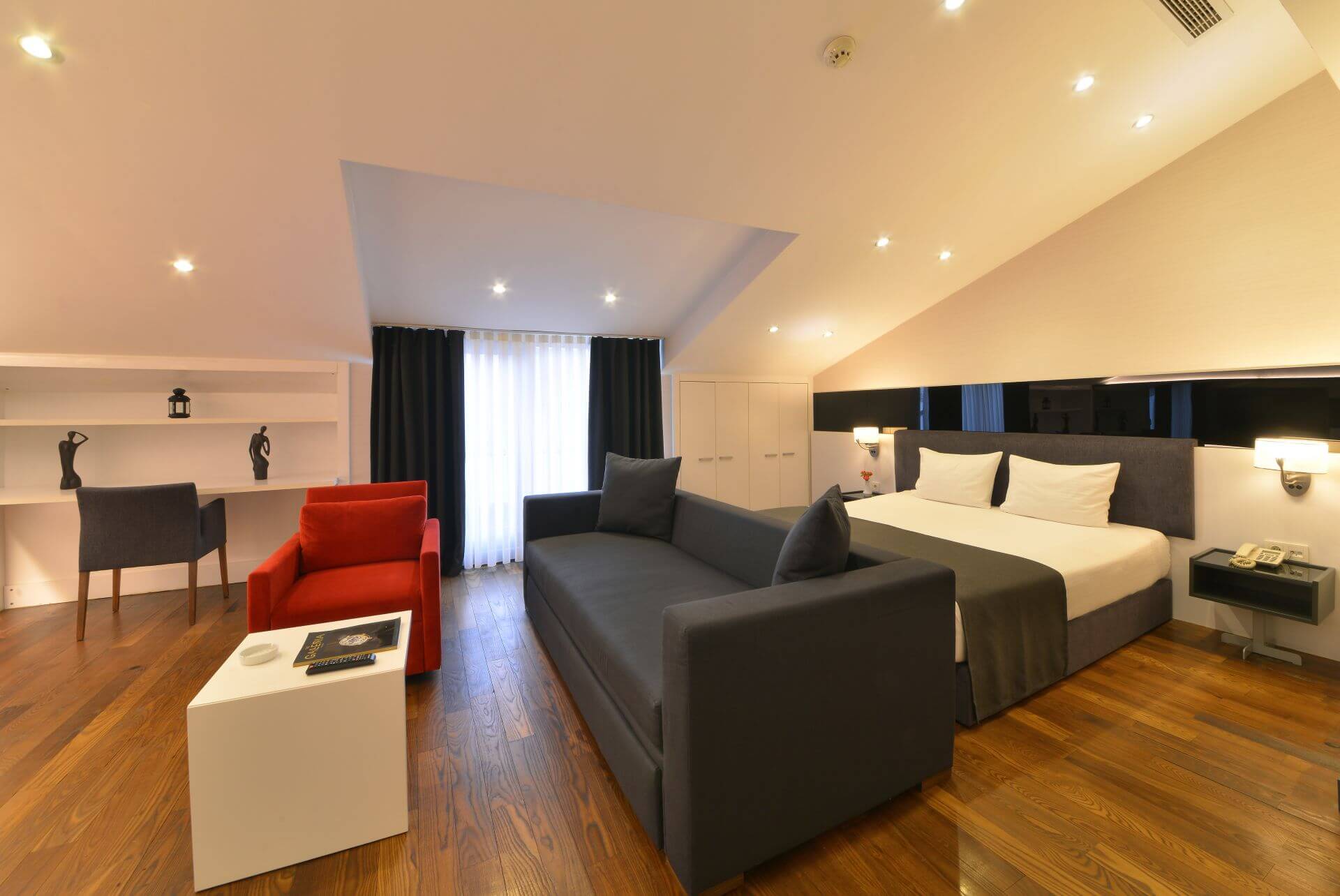 Deluxe Terrace Suite’s 45 m² büyüklüğe sahiptir. Süitimizde çift kişilik yatak, özel olarak dizayn edilmiş gardırop, LED TV ve mini bar bulunmaktadır. Salon bölümüne yer alan yatak olma özelliğine sahip koltukla 4 kişiye kadar konaklayabileceğiniz, mutfak ve yemek masasının da bulunduğu ayrıcalıklı süit odalarımızdan biridir. Beşiktaş günlük kiralık daire deneyimini 5 yıldızlı süit otel konforunda yaşamak için Deluxe Terrace Suite’s ilk tercihiniz olabilir.